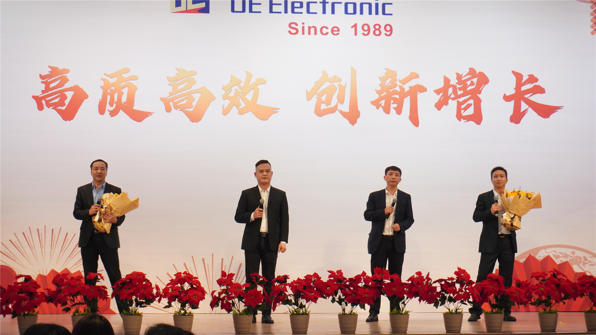 ? ? ? ? 由董事長(zhǎng)黃子田先生帶領(lǐng)由核心管理人員組成的迎賓團(tuán)隊(duì)在與會(huì)UE人熱烈的掌聲中入場(chǎng),晚會(huì)正式拉開序幕。董事長(zhǎng)黃子田先生向全體員工致新年賀詞,并致以節(jié)日的問候和祝福,對(duì)全體員工一年以來的辛勤付出表示肯定和感謝;對(duì)新的一年提出了新的期望。黃董表示:2024年是迎接又一輪挑戰(zhàn)的新起點(diǎn),我們要更加聚焦公司的OKR目標(biāo),緊緊圍繞“高質(zhì)高效·創(chuàng)新增長(zhǎng)”的年度主題,提升UE品牌的競(jìng)爭(zhēng)力;激勵(lì)UE人要持續(xù)謹(jǐn)記并踐行“思源、聚能、創(chuàng)新、分享”的核心價(jià)值觀,以“龍”的精神,砥礪前行,不斷超越自我,為UE的高質(zhì)量發(fā)展奮斗,共創(chuàng)UE更加美好的未來!