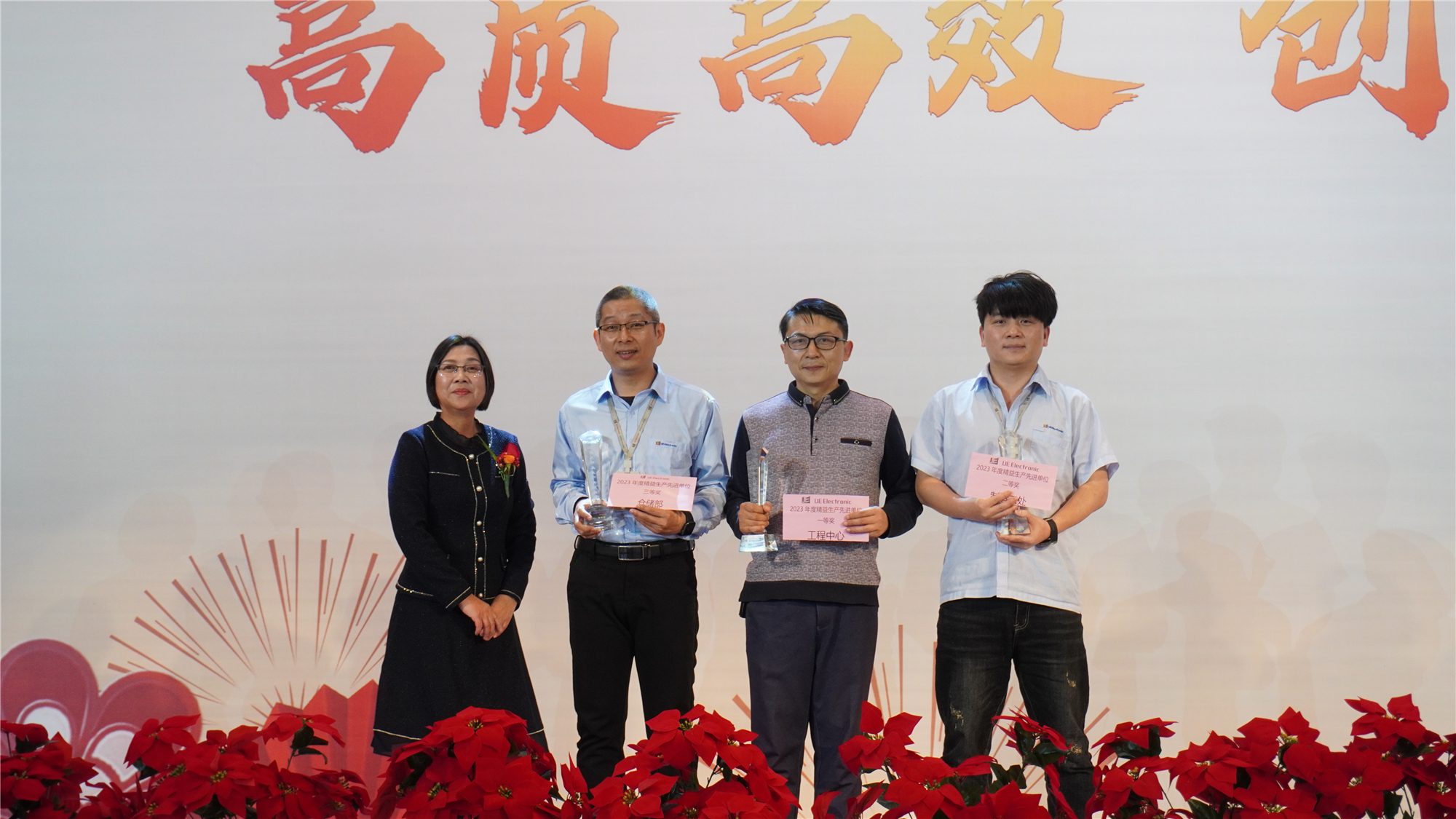 ? ? ? ? 晚會(huì)上半部分是年度頒獎(jiǎng)和晚宴環(huán)節(jié)。在年度獎(jiǎng)項(xiàng)表彰環(huán)節(jié)中,公司結(jié)合獎(jiǎng)項(xiàng)評(píng)比規(guī)則,對(duì)有突出績(jī)效表現(xiàn)的個(gè)人及團(tuán)隊(duì)給予肯定和激勵(lì);對(duì)公司忠誠(chéng)服務(wù)十年以上的老員工們的忠誠(chéng)與堅(jiān)守,表示感恩和尊敬。感恩他們的持續(xù)付出,堅(jiān)守成就夢(mèng)想,為UE事業(yè)的騰飛做出了巨大貢獻(xiàn),特此為功臣們頒發(fā)紀(jì)念獎(jiǎng)杯和獎(jiǎng)金。在敬酒環(huán)節(jié)中,公司核心管理團(tuán)隊(duì)首先上臺(tái)祝酒,隨后帶領(lǐng)各部門管理人員,相繼到各桌給UE家人們進(jìn)行敬酒,感謝大家一年以來的辛苦付出,并祝愿大家新年快樂。UE家人共同感受溫馨氛圍,在開懷暢飲的同時(shí)齊聲高喊“UE UE,永遠(yuǎn)第一”的口號(hào),共同期待公司在新的一年里向著更高的目標(biāo)展翅翱翔。